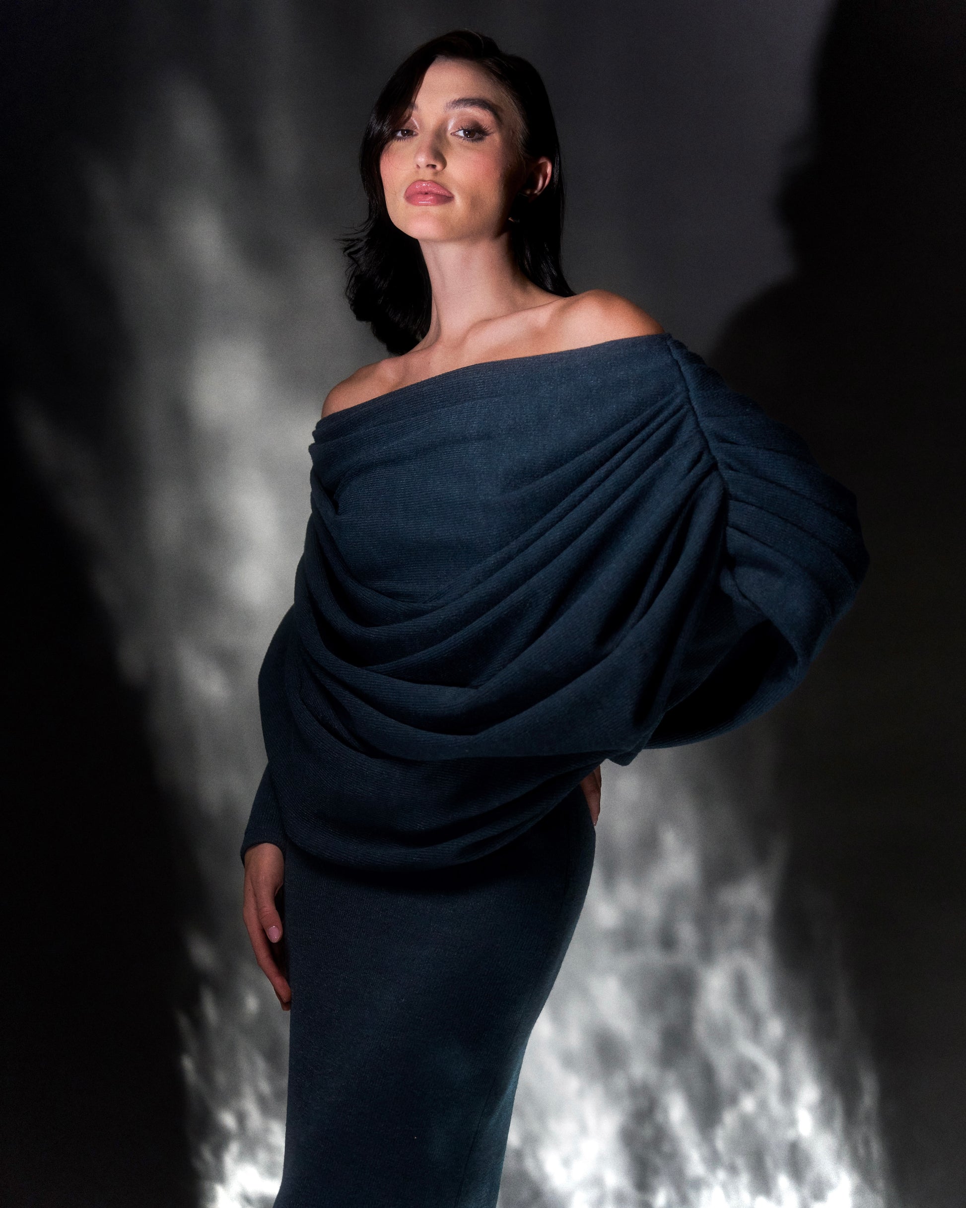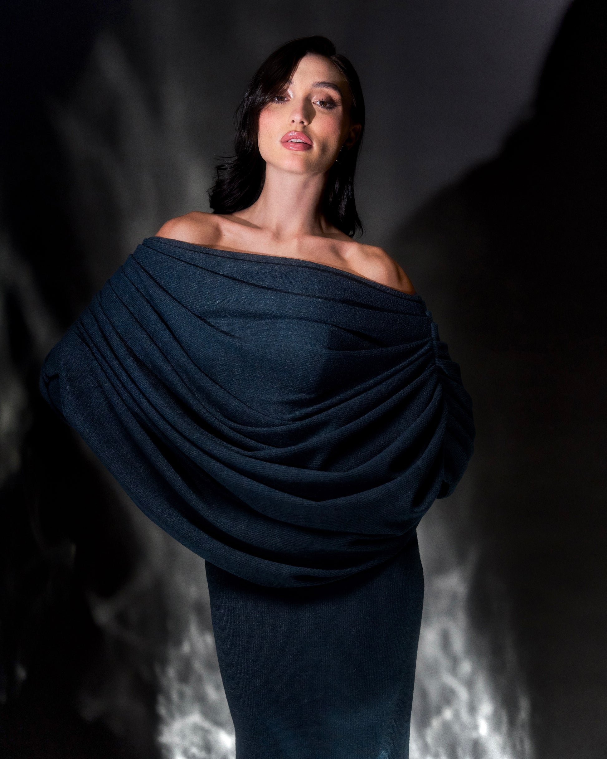 Massaya, an iconic midnight muse made of warm knit fabric in a deep blue hue.