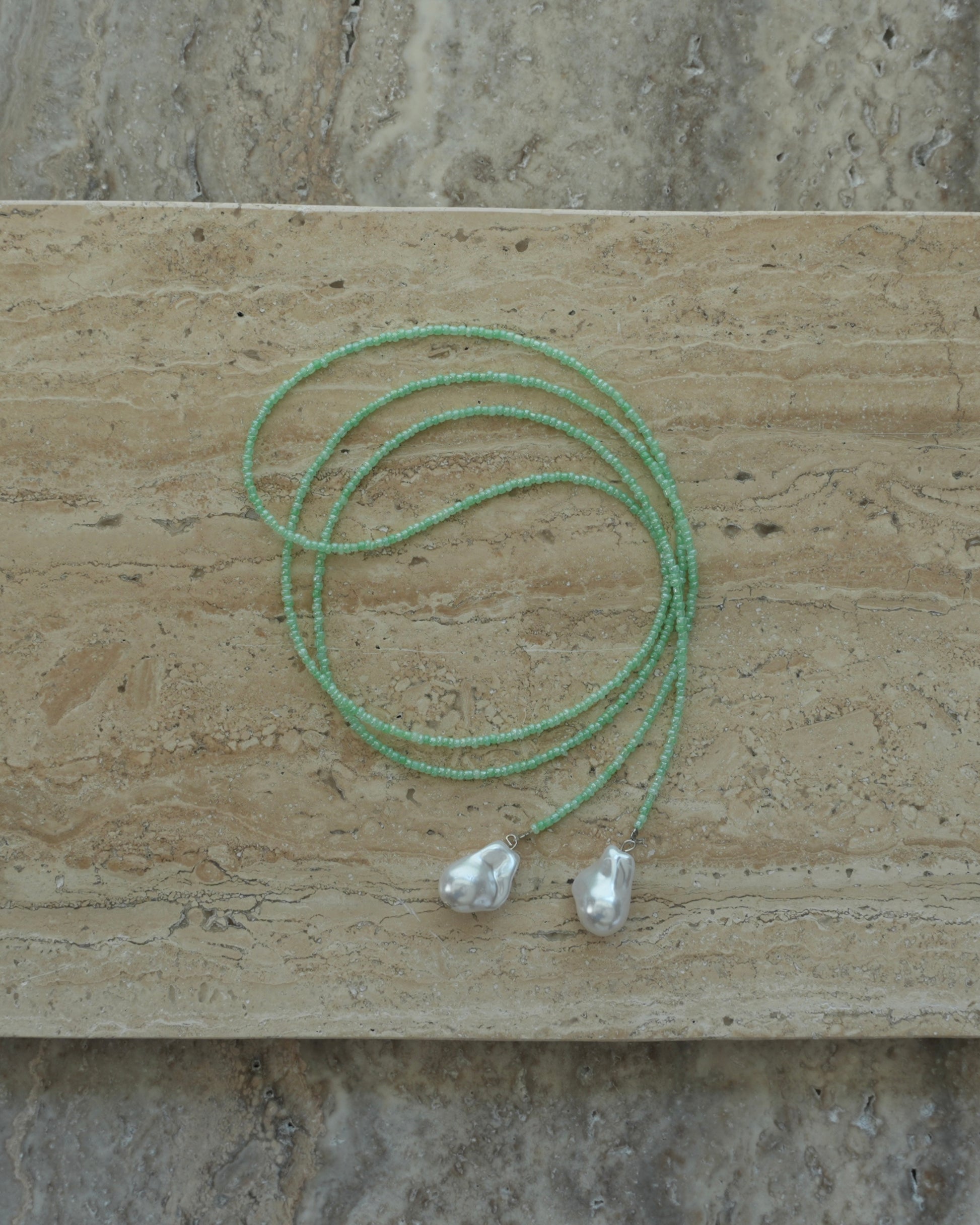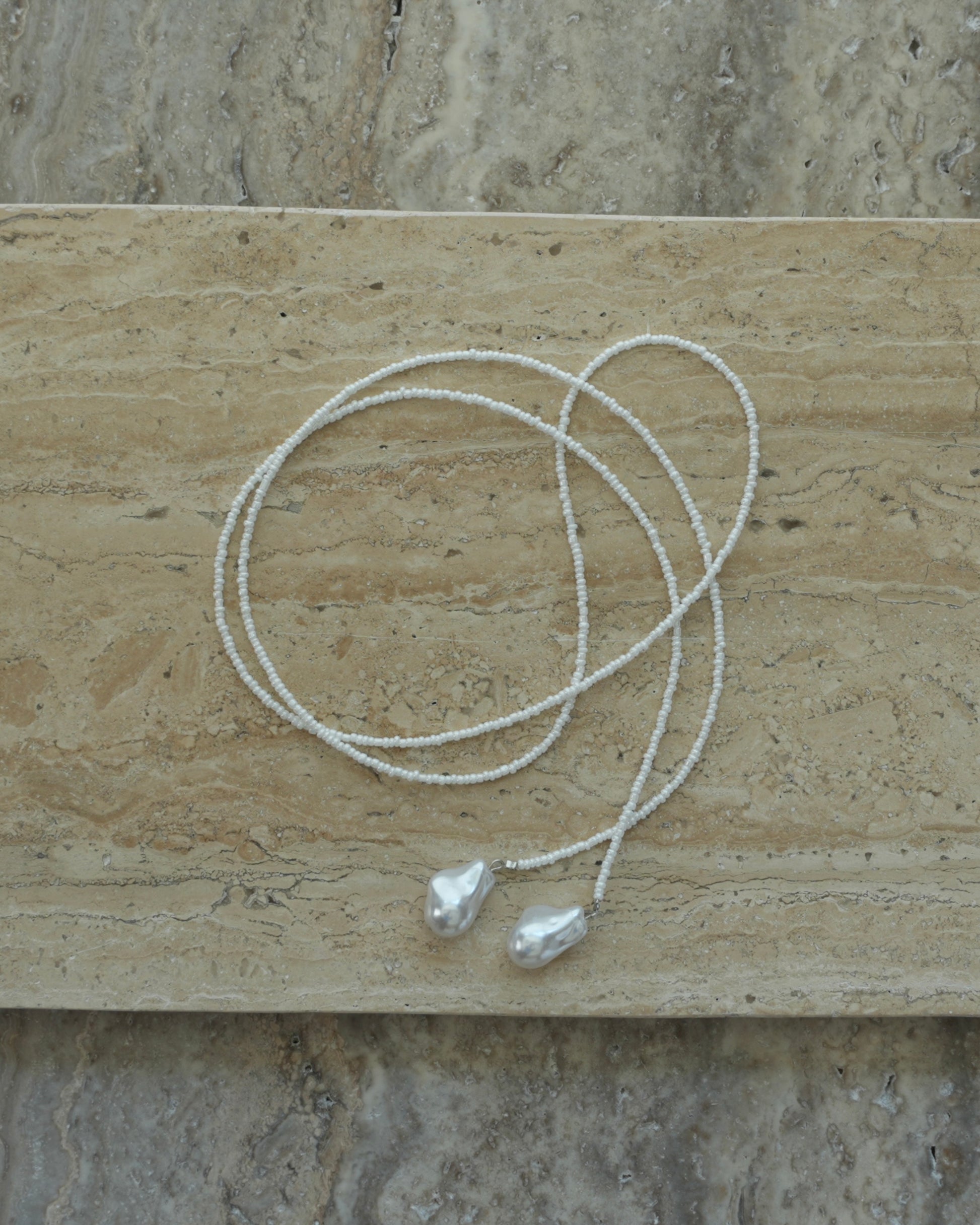 Beaded cord necklace with baroque pearls.