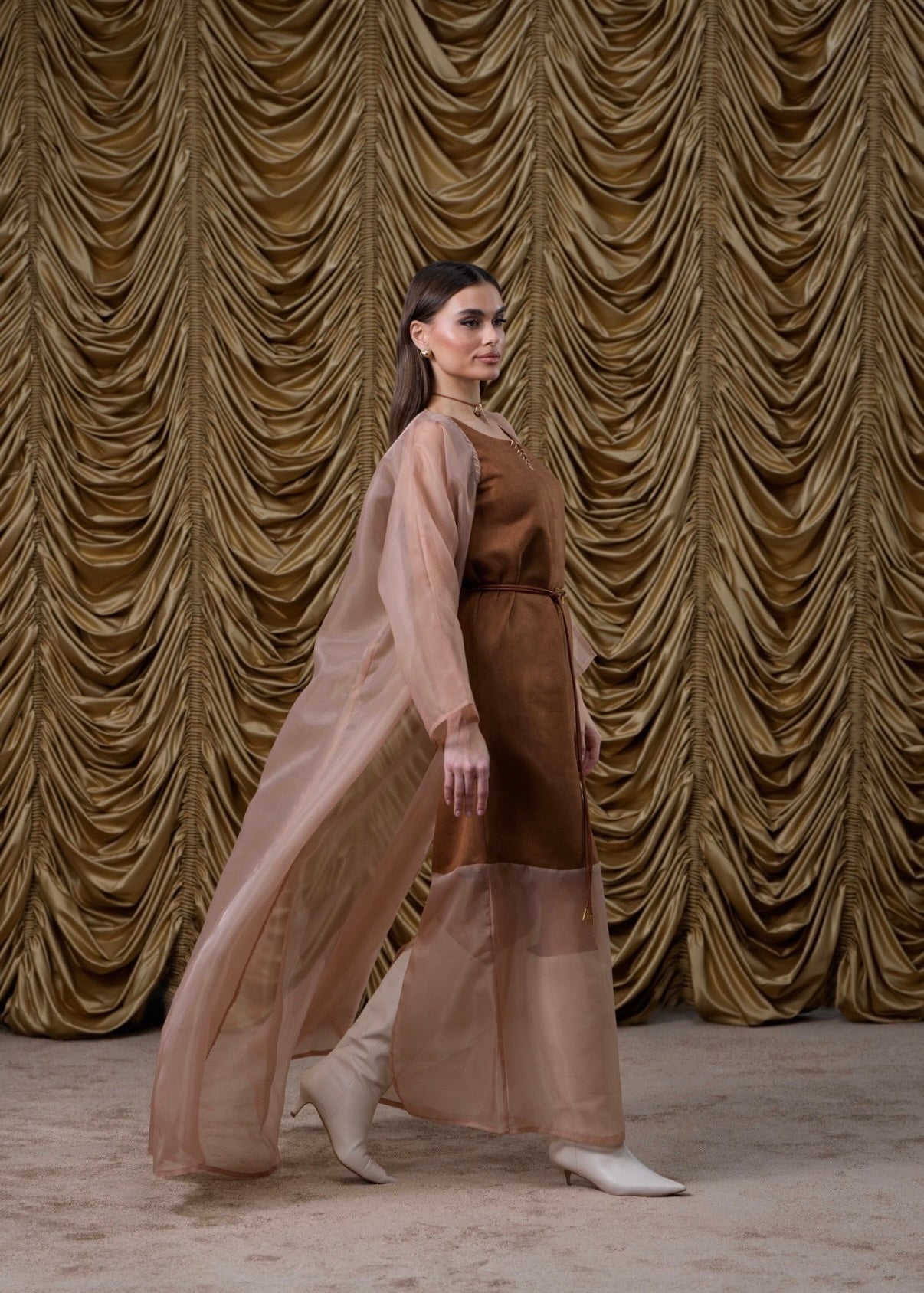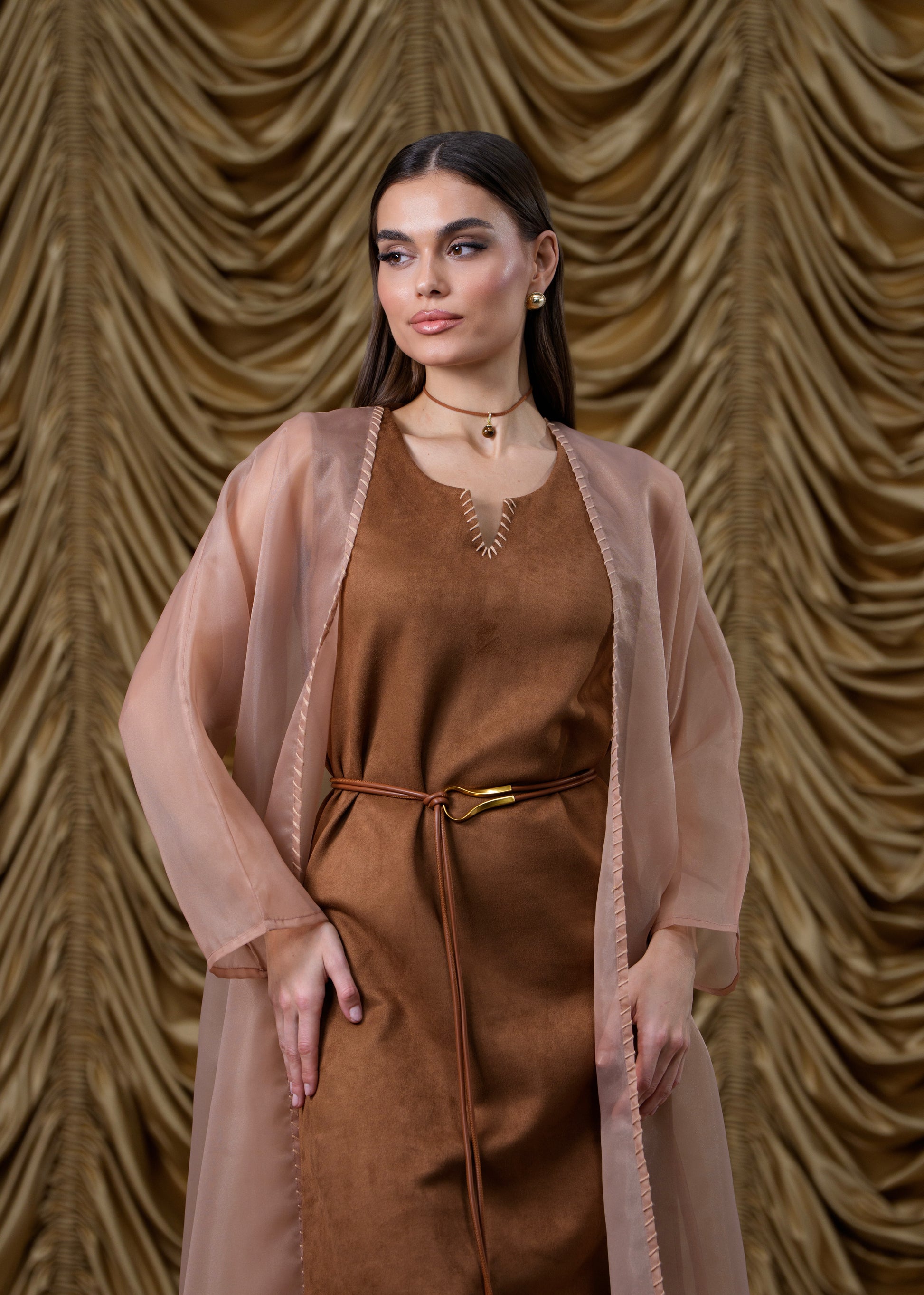 A suede dress and organza bisht set with touches of our signature whipstitching. *Belt NOT included.