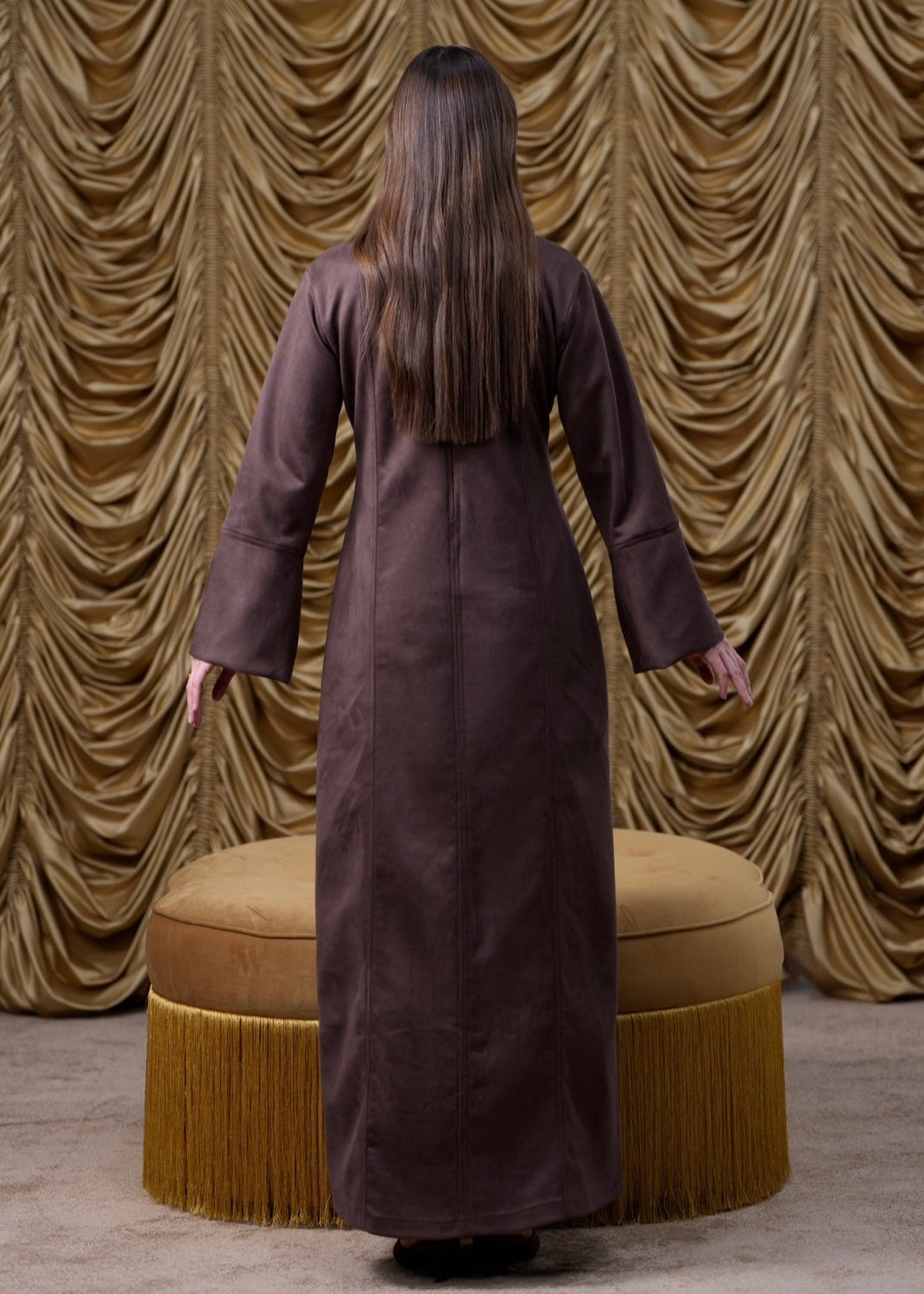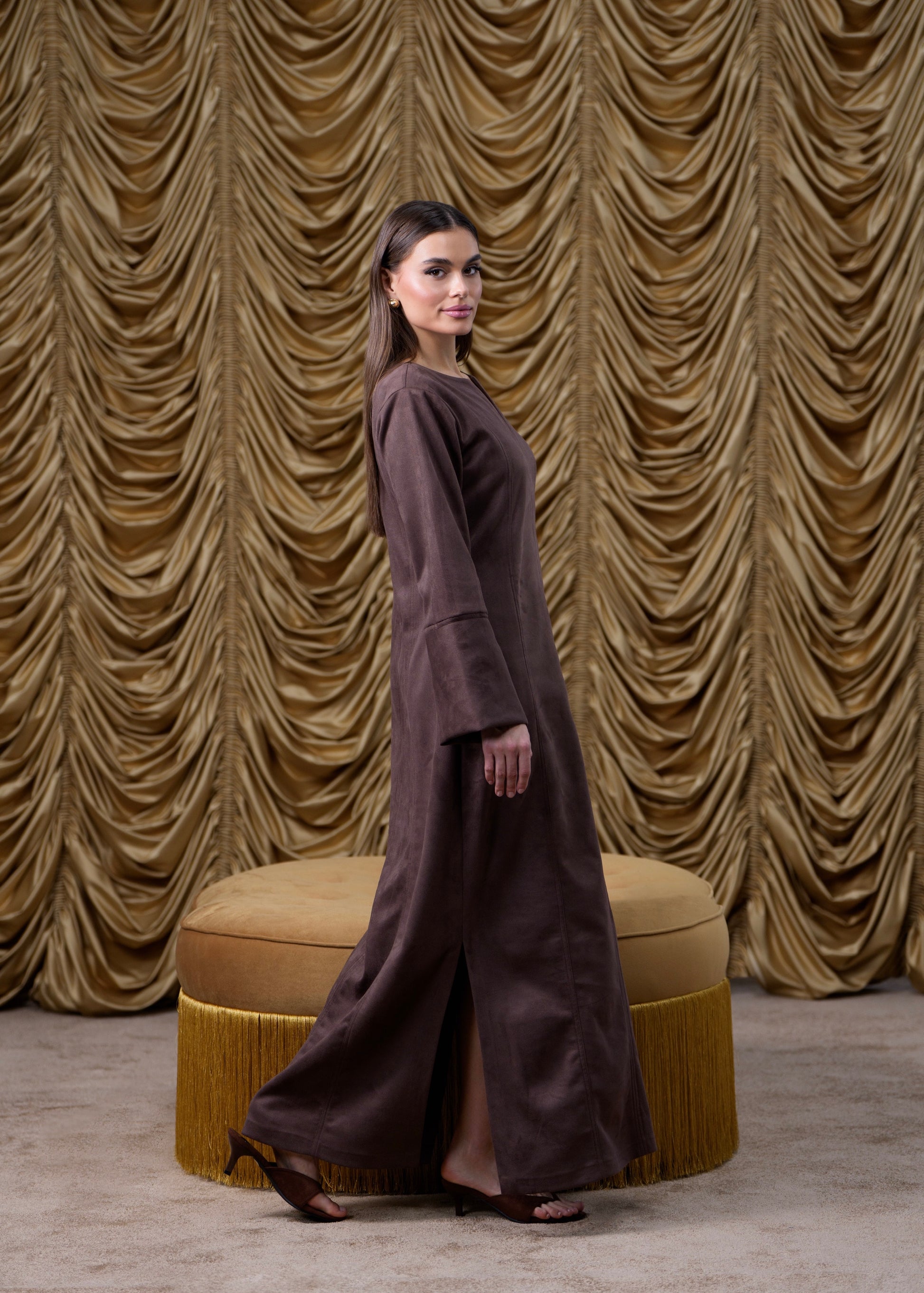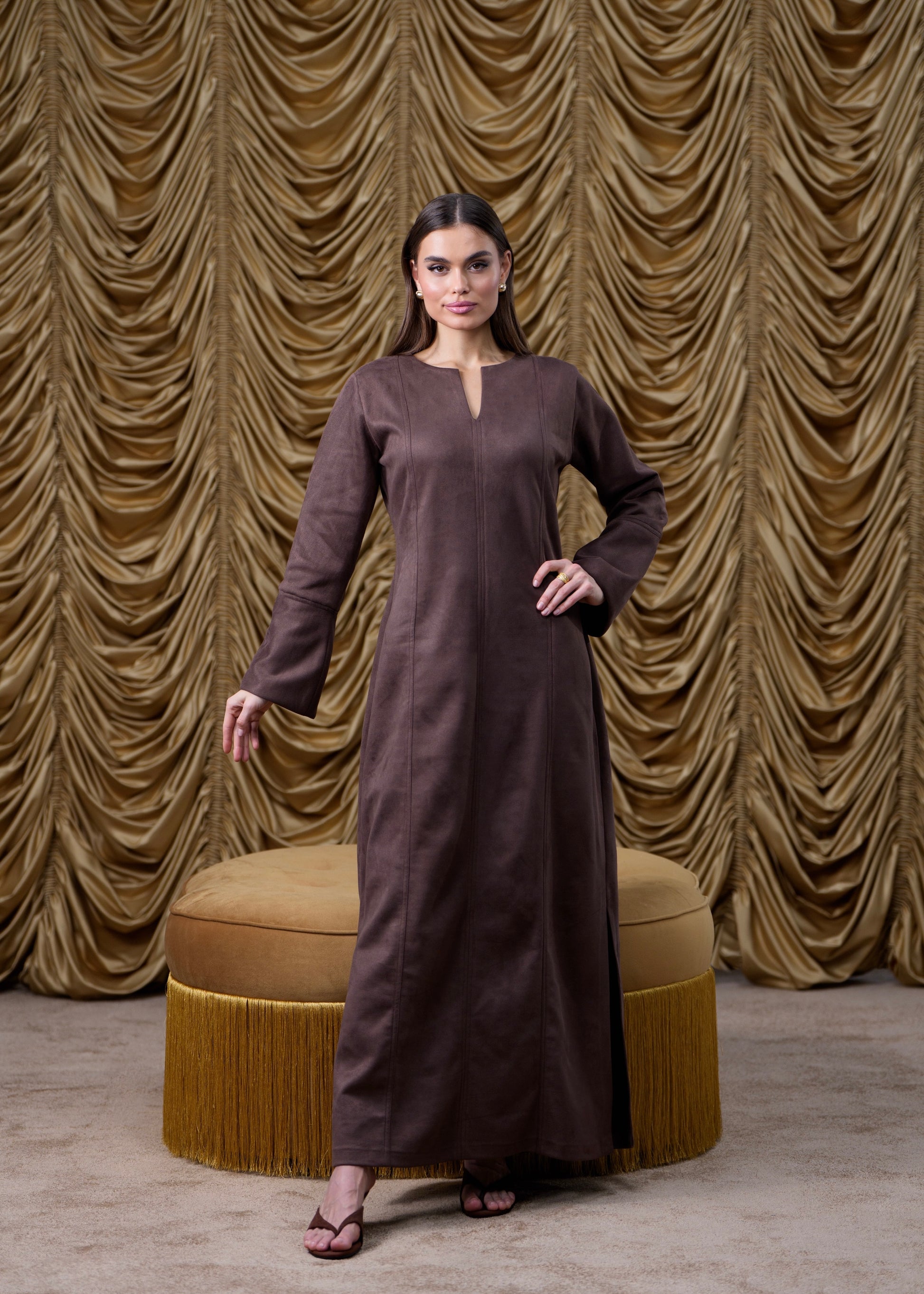 A staple suede dress designed for a structured fit with paneled stitching and side slits.