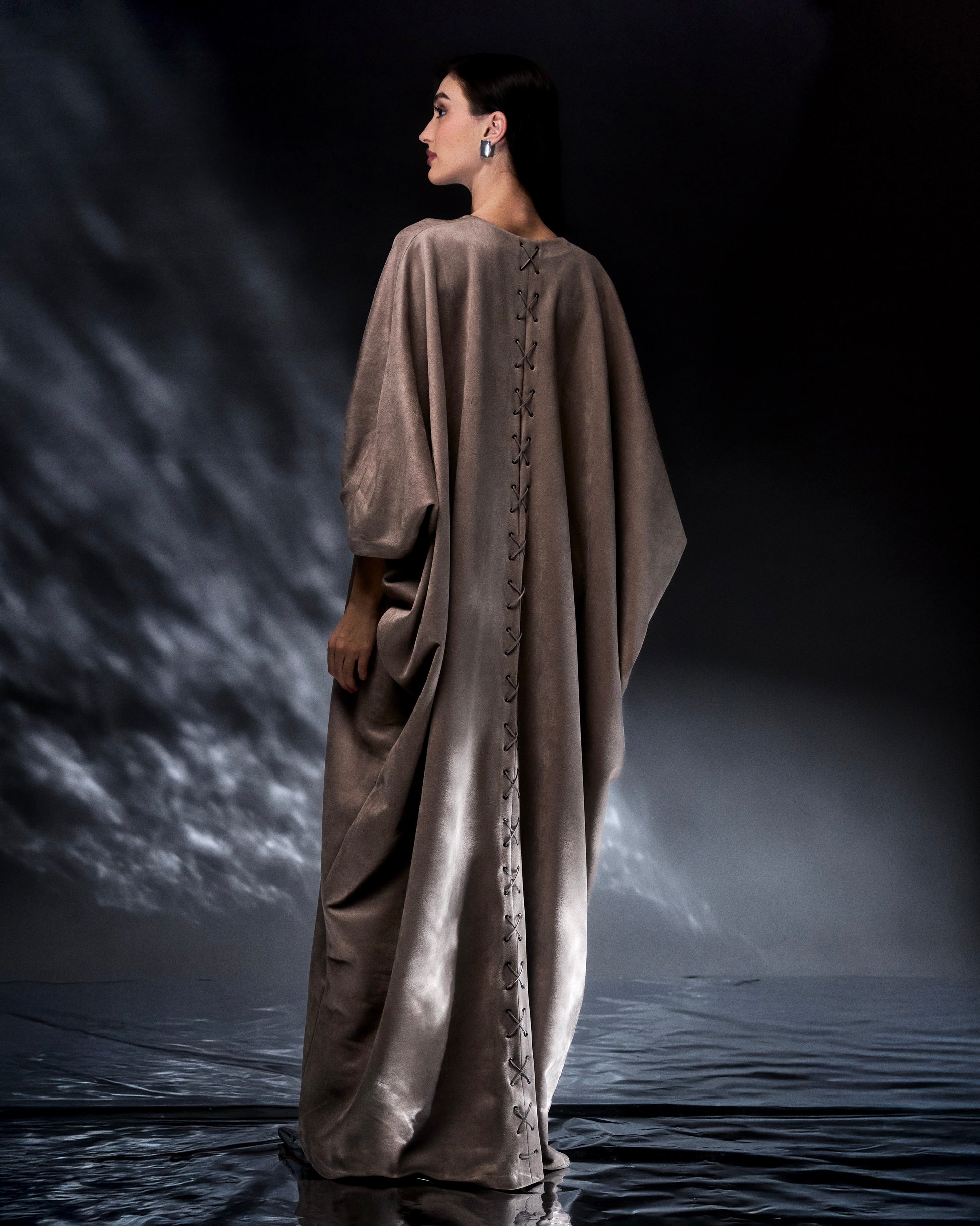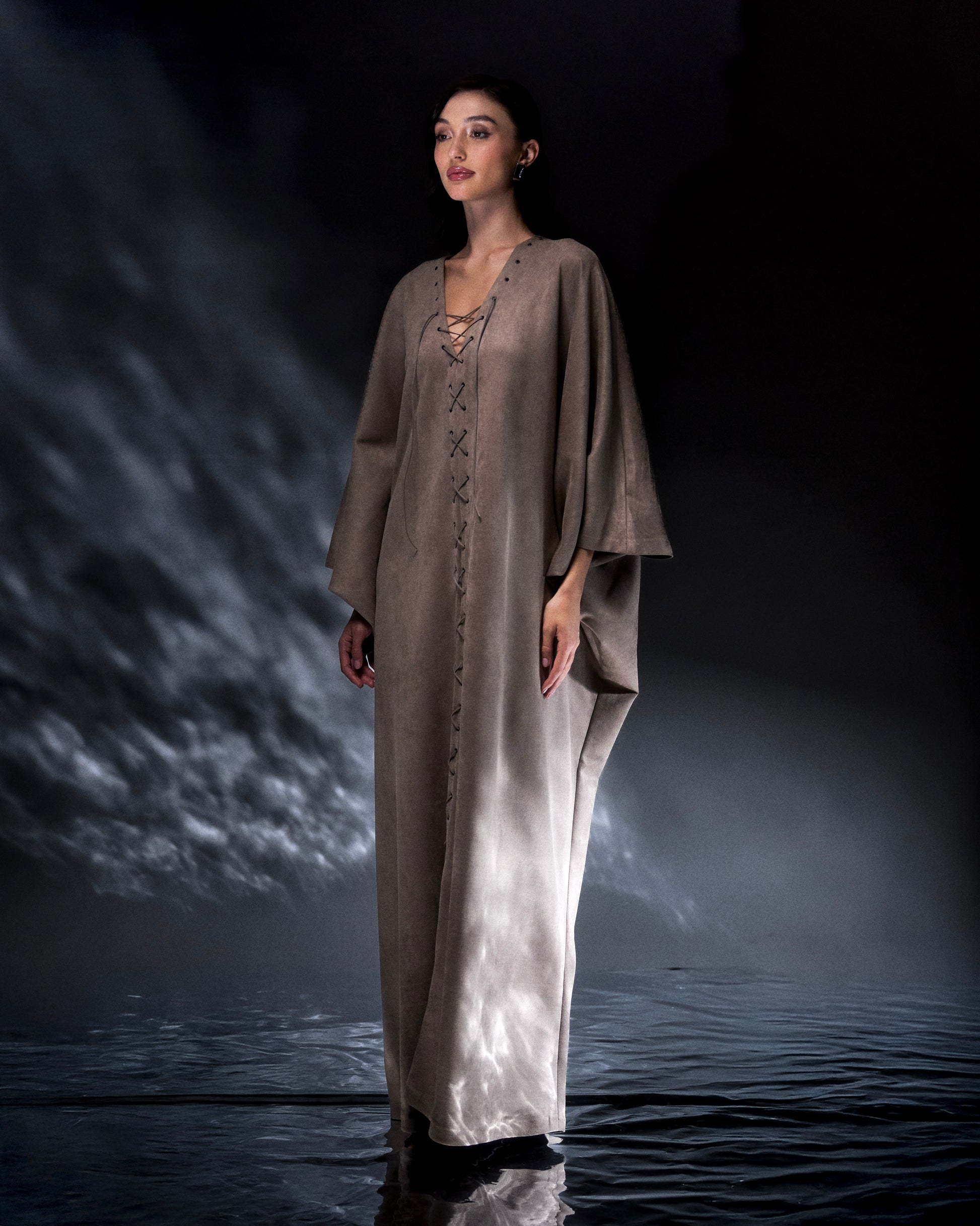 A classic grey suede kaftan elevated with lace-up detailing in the front & back. Model is wearing S/M. Length is 54 inches